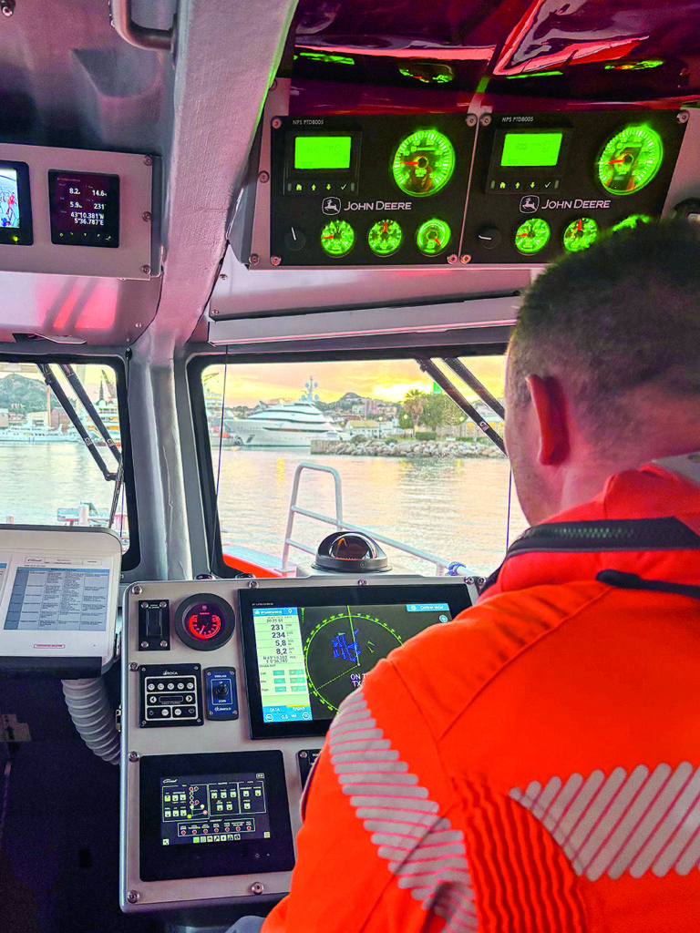 À l’intérieur, sur bâbord, une large banquette médicalisée peut accueillir le plan dur nécessaire aux blessés de la colonne vertébrale. Une bouteille de 15 litres d’oxygène permet de traiter un plongeur en détresse quand le canot intervient sur un accident lointain. Le poste de conduite est situé à tribord avant. En vis-à-vis sur bâbord, se trouve celui du radionavigateur et derrière, un troisième poste est réservé à celui qui assurera la fonction de coordinateur de l’opération de sauvetage – on scene commander. Les trois postes sont bardés d’écrans tactiles, qui évoquent la passerelle d’une frégate moderne. Un système de caméras permet de visualiser la salle des machines.