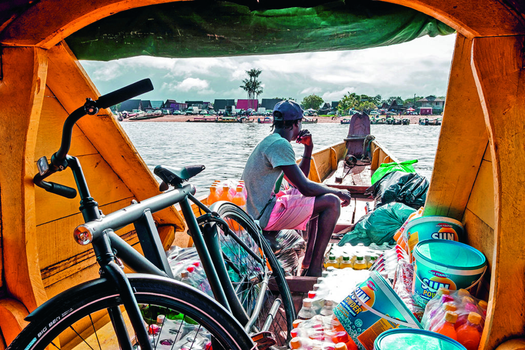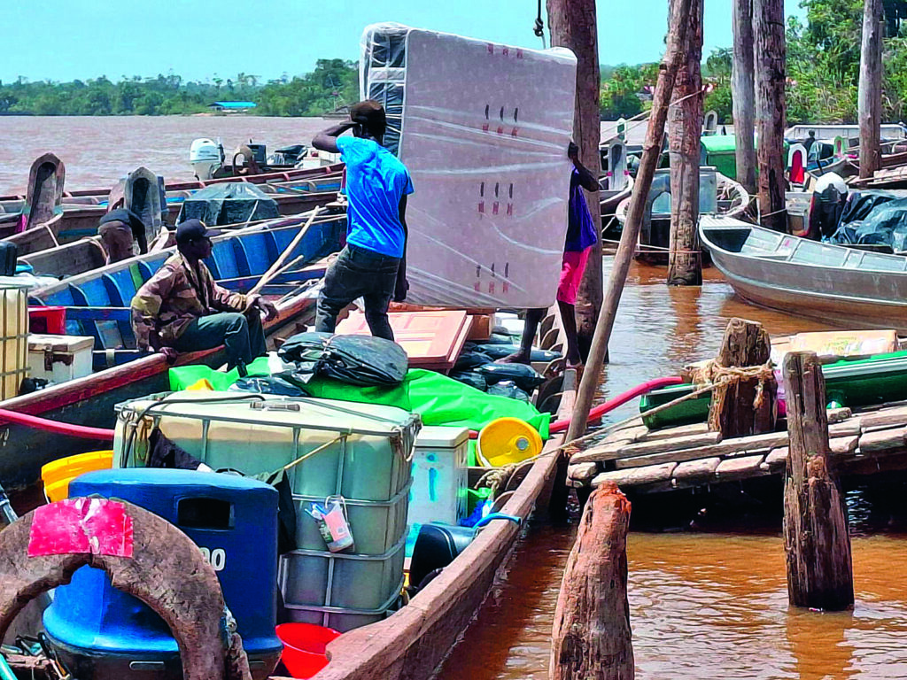 Samedi. Premier jour. C’est à Albina, la ville surinamienne faisant face à Saint-Laurent-du-Maroni, que Sawami entame le voyage qui nous emmènera à Maripasoula, à 300 kilomètres au sud, en pleine forêt amazonienne. Le chargement minutieux de la pirogue prend la matinée : l’équilibre doit être parfait. On embarque bois de charpente, ciment français, faux marbre espagnol, portes, sommiers et matelas brésiliens, deux gazinières, des caisses de lessive, un évier métallique et des chick’n chips de Trinidad. Le tout est soigneusement recouvert d’un prélart. Au total, Sawami transporte 7 tonnes de marchandises, plus une cuve en plastique de 1 000 litres de carburant achetés chez un négociant chinois.