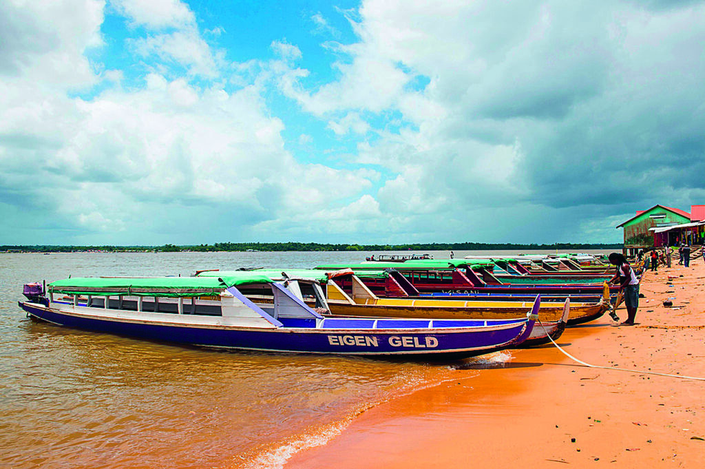 Sawami (« C’est mon nom et mon prénom », assure-t-il en souriant), Leendert, le matelot « takariste » (ou bossman, celui qui manie perche et pagaie), et Willem, matelot et cuisinier, sont des familiers du Maroni, qui a le statut particulier de fleuve international. Sous un ciel bleu, dans une forêt épaisse et sur une eau brune, le fleuve sert de frontière entre la Guyane et la république du Surinam, mais pas depuis longtemps.