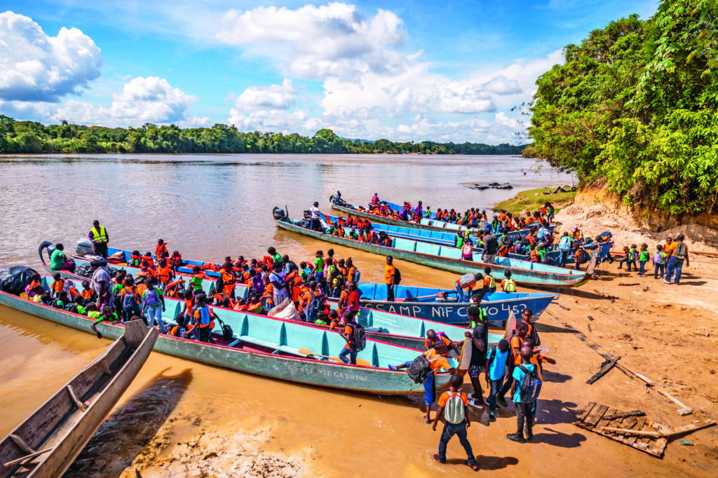 Les toponymes, Ankel, Sparouine, Patience, Bambie Kampoe, Kwali Ondoe 1, Nideng Kampoe, Kwali Ondo 2, sont des mélanges de langues locales et importées. Apatou (France) et son superbe collège apparaissent au milieu de l’après-midi. Les pirogues scolaires municipales – seul moyen de transport pour les élèves – attendent leurs passagers avec des gilets de sauvetage bien visibles et facilement accessibles. Ceux-ci sont devenus obligatoires pour les enfants après des naufrages dramatiques sur les sauts. Très peu d’adultes en portent. Au-delà d’Apatou, les kampoes, habitats temporaires situés près de parcelles cultivées, s’espacent de plus en plus.