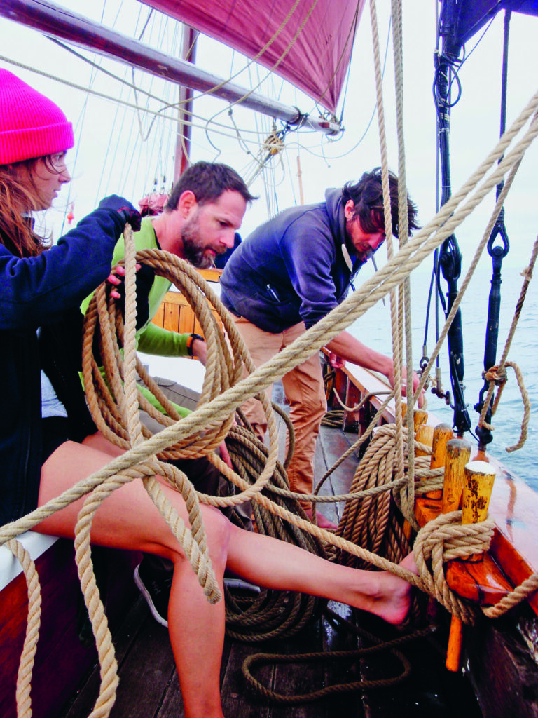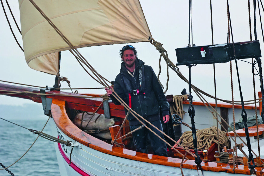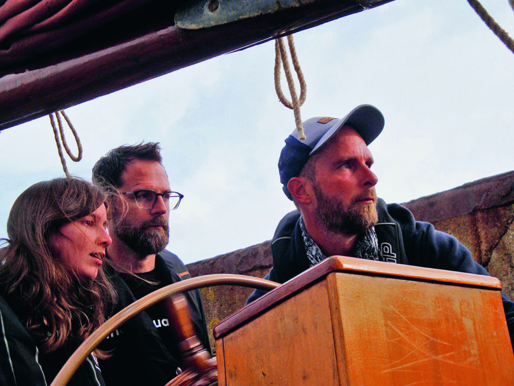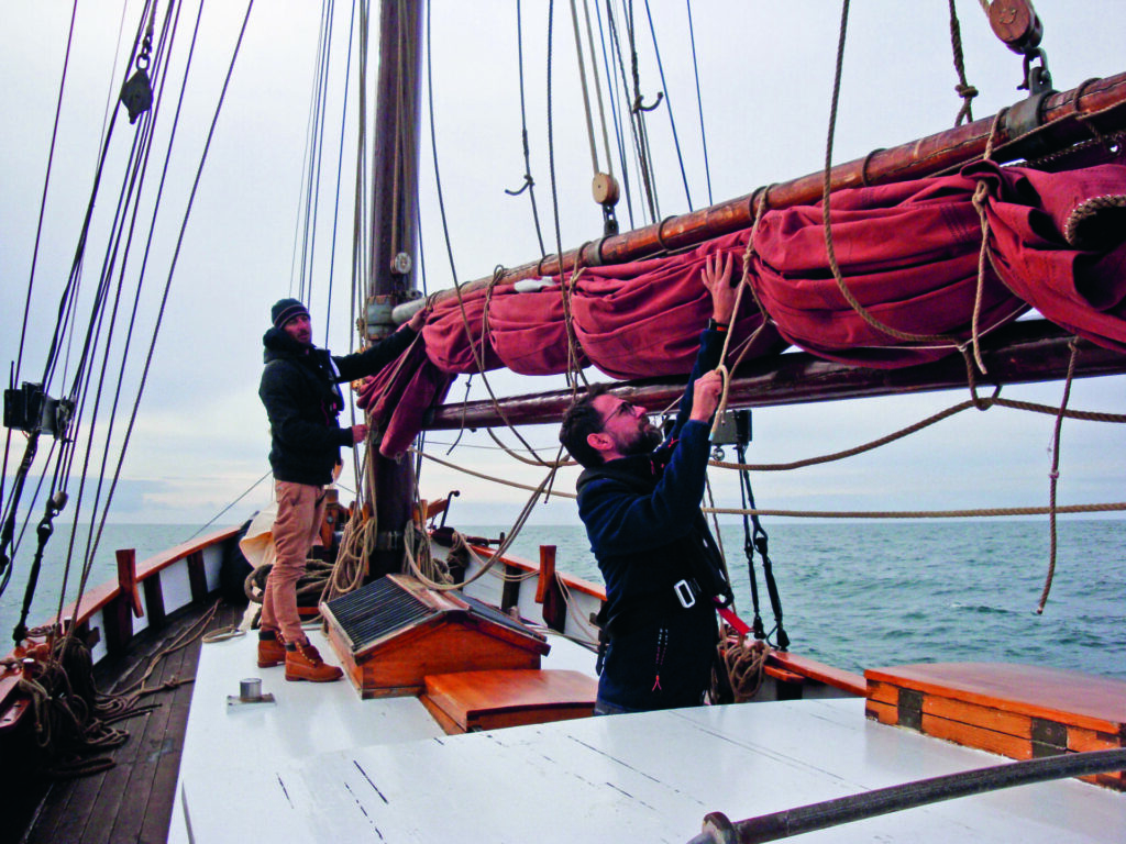 Pour l’avant-dernier jour de navigation, le vendredi, nous mettons le cap sur Groix, portés par la brise thermique qui s’est levée en milieu de journée. Cette escale nous permettra de longer, le lendemain, la côte ouest de l’île, sauvage et escarpée. Les colonies de lichens colorent de jaune les rochers sombres qui tombent à pic dans la mer. Juste avant d’atteindre le phare de Pen-Men à l’extrémité ouest de l’île, nous prenons un ris dans les voiles. Le ciel est lourd et gris. Nous sortons les cirés et les vestes de quart. Le front d’une dépression nous tombe dessus, mais le vent manque encore pour virer ; il faut donner un coup de moteur pour aider Jane à tourner. Tandis que nous rentrons à Port-Louis, Giulia se confie sur cette première expérience de voile. Elle a été frappée par l’esprit d’équipe qui règne sur Jane : « Tout le monde s’y met pour faire avancer le bateau, c’est ça qui est beau ». J’éprouve le même sentiment à chaque fois que j’embarque sur un bateau traditionnel. Il vaut toujours mieux être deux pour tirer sur un bout. Nous n’avons pas encore touché terre que Giulia et Fabio s’intéressent déjà au programme de l’année prochaine qui s’annonce aventureux : Kevin et Quentin rêvent de naviguer sur les routes anciennes des hajkutters qui allaient pêcher aux îles Féroé… ◼