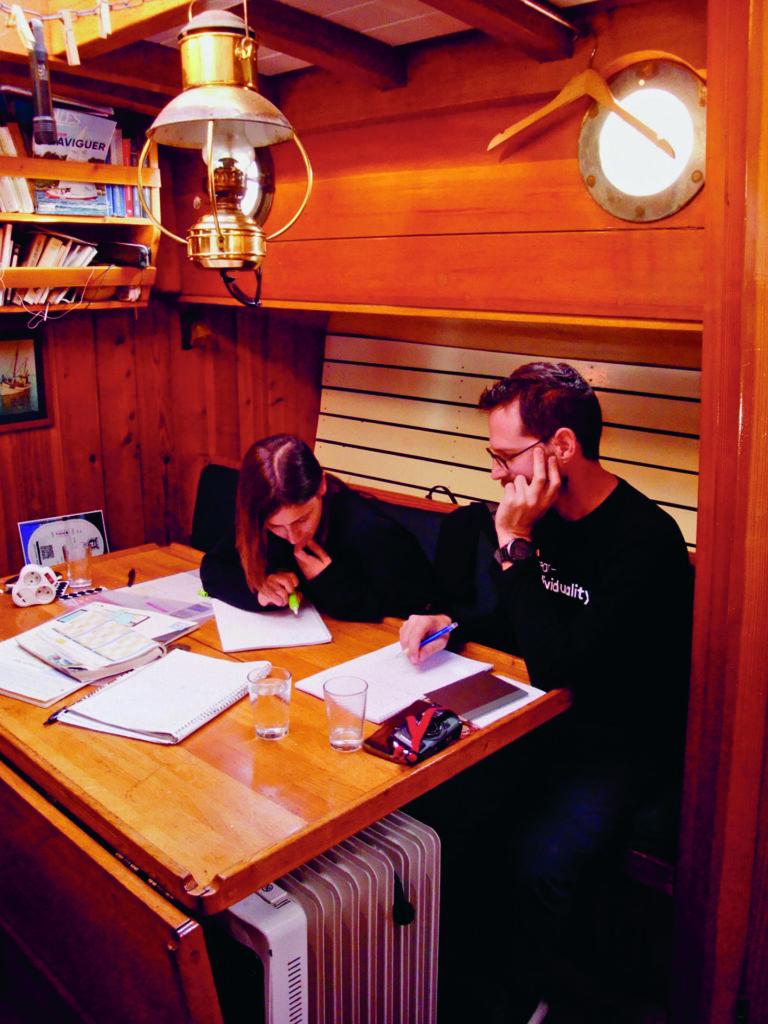 Kevin se montre rassurant : on ne sort le bateau que lorsque les conditions sont bonnes. Or ce lundi, Jane est « pressée » contre le quai à cause du vent. Il vaut mieux rester au port pour organiser la semaine. Installés dans le carré, les moniteurs passent en revue, avec les stagiaires, les applications météo ainsi que les cartes marines pour déterminer un itinéraire provisoire. Un vent d’ouest nous permettra de faire du portant vers l’est jusqu’aux îles des Glénan, puis nous descendrons vers Lorient. En attendant, il faut remplir la cambuse. Chaque équipier est responsable de la préparation de deux repas dans la semaine. Giulia et Fabio inaugurent nos repas collectifs avec une carbonara pour le midi. Kevin donne ensuite sa première leçon théorique, le calcul des marées. L’appareillage est prévu à 10 h le lendemain matin. Nous nous endormons, bercés par le léger ressac et le grincement des aussières.