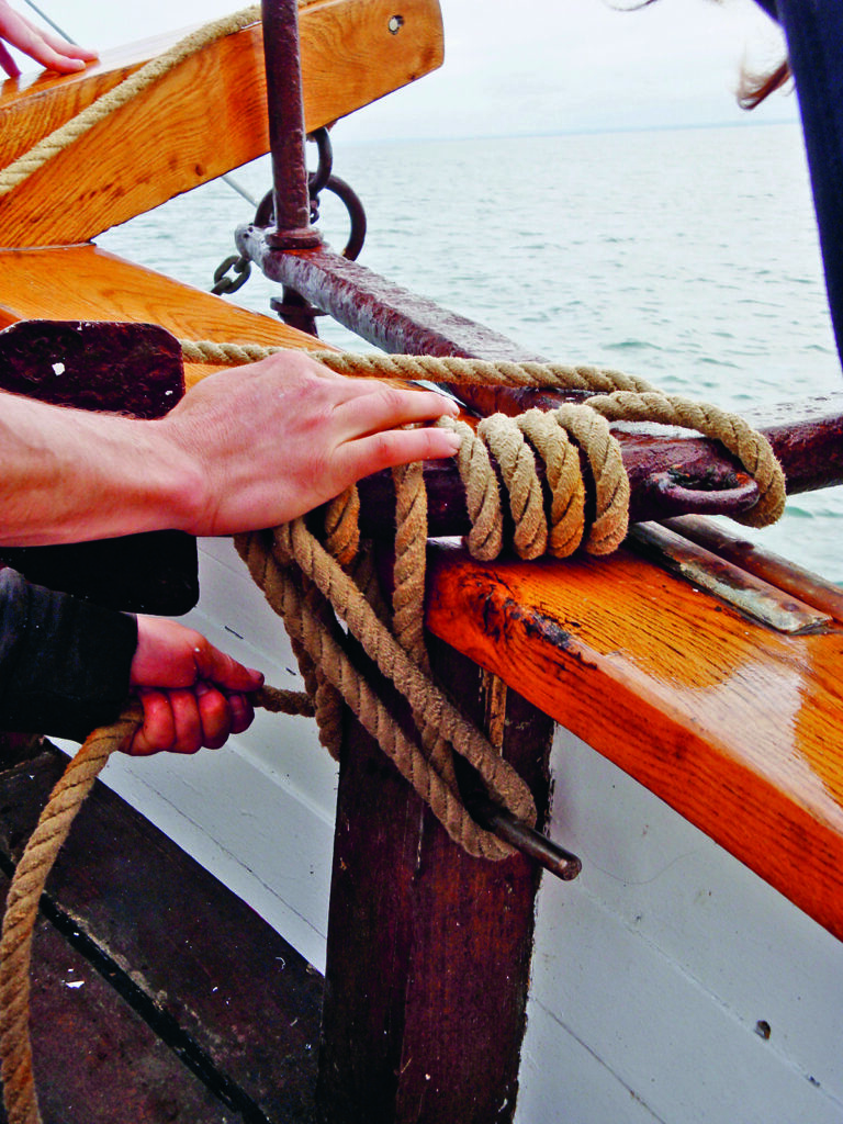 Après un copieux petit déjeuner, il faut sécuriser le voilier et tout arrimer à l’intérieur du bateau. À peine les feux du port franchis, les deux stagiaires établissent les voiles sur les instructions de Kevin. Grand-voile, puis foc et trinquette. Fabio est à la drisse de mât, Giulia à la drisse de pic. Il s’agit d’être bien coordonné. Au moment d’étarquer, Fabio « fait l’arbalète », selon les mots de Kevin : la drisse passée sous le cabillot, le stagiaire la tend comme la corde d’un arc. Giulia reprend le mou au maximum. Puis ils s’attaquent au foc et à la trinquette. Giulia toujours à la drisse, Fabio à l’écoute. Kevin met fin à la manœuvre avec un « Nickel » sonore, un tic de langage vite repris par Giulia. La jeune Suissesse ne parle pas très bien français, mais elle prend vite les réflexes !