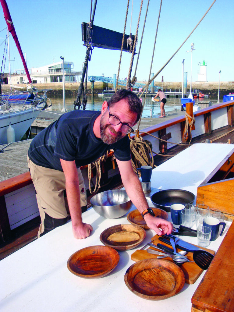 À quelques encablures de l’archipel, après deux virements de bord, Quentin et Kevin lancent le vieux moteur Volvo Penta de 1965 qui entraîne la grosse hélice d’origine, pour arriver à temps avant le coucher du soleil. Rien ne sert de s’acharner à louvoyer si on « met deux fois le temps et trois fois la peine ». Quand nous arrivons au mouillage de la Pie près de l’île Saint-Nicolas, Kevin explique à Fabio et Giulia comment calculer la longueur de chaîne nécessaire pour ne pas déraper cette nuit. C’est la fin de saison, mais la carte postale est parfaite : le sable est blanc et l’eau turquoise. Nous allons boire un verre au seul bar de l’archipel, La Boucane, avec l’annexe. Quentin rêve de construire une annexe en bois pour Jane. Il a terminé sa formation en charpente marine à Skol ar Mor à Saint-Nazaire. Il voulait mieux comprendre la construction des voiliers en bois pour savoir prendre soin de Jane. « Quand tu vois faire tes maîtres de stage, tu relativises, tu te rends compte que dans le bois tout est réparable », s’enthousiasme-t-il.