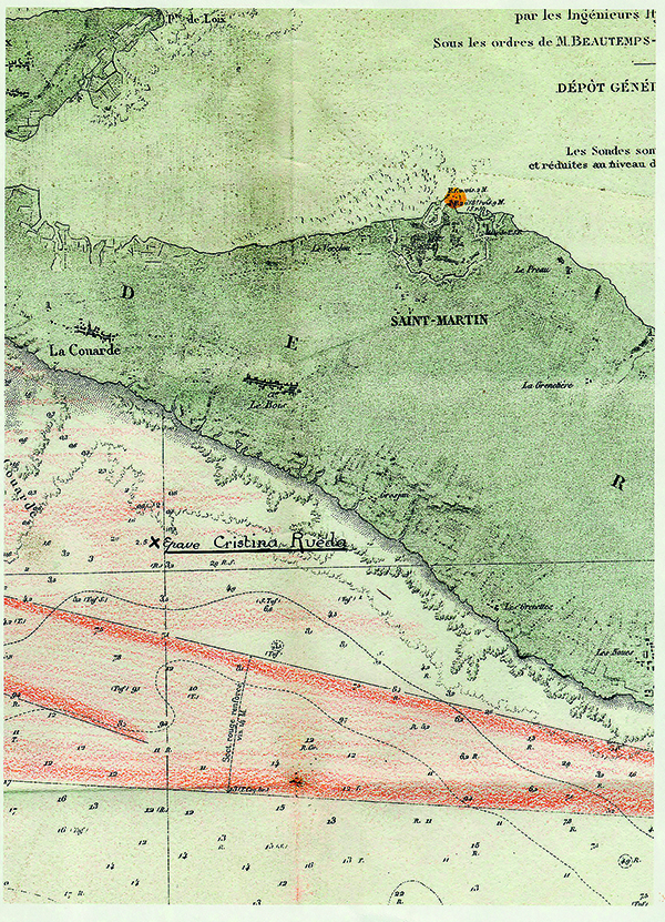 La nuit est plus terrible encore. Le vent atteint la force de l’ouragan, la mer est énorme, aucune clarté, c’est la nouvelle lune. Dans ces conditions dantesques, le capitaine Monasterio a-t-il tenté de se réfugier au mouillage à l’abri des îles, ou de relâcher à La Pallice ? On ne sait pas. Toujours est-il que son navire se trouve trop au nord de la route pour engainer le pertuis d’Antioche. Bien trop près des roches débordant le littoral de l’île de Ré, il a pu cependant parer les dangers de Chanchardon.