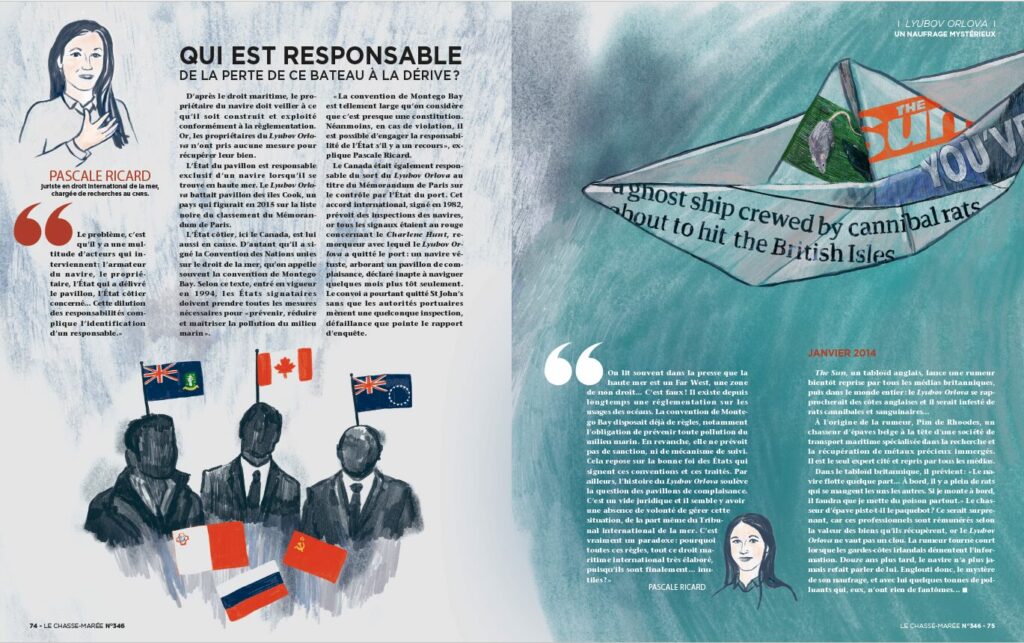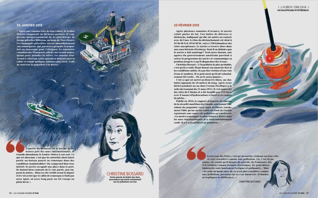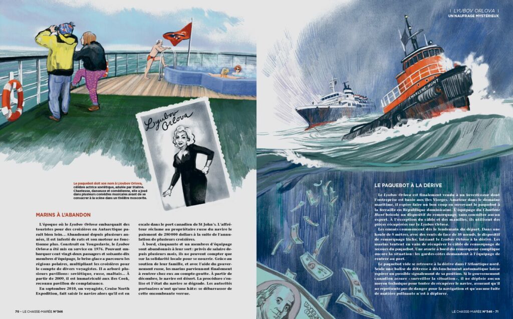 Texte de Virginie de Rocquigny et dessins de Carole Conan – En 2013, le paquebot brise-glace Lyubov Orlova disparaissait dans l’Atlantique nord lors de son dernier voyage pour la casse. Il n’a plus jamais refait surface. Sa destinée illustre les limites du droit international sur la protection des océans.