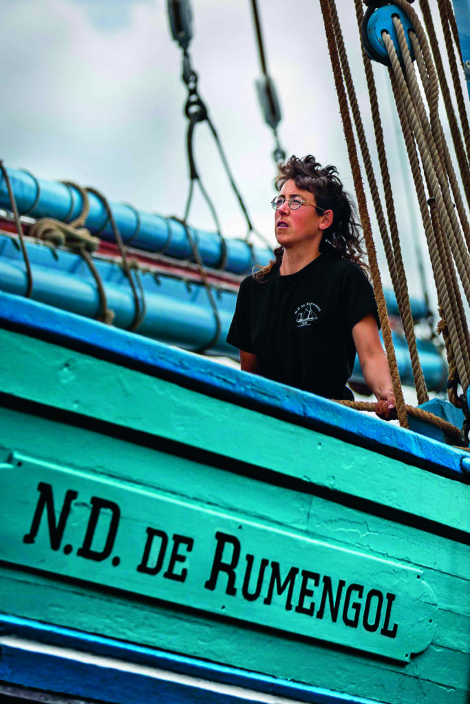 Dans la passerelle, où elle carbure au café noir, Gwen se définit elle-même comme la grande gueule, celle qui parle un peu plus fort, se couche un peu plus tard. C’est aussi la plus attachée à ce bateau. Même quand son contrat saisonnier est terminé, elle ne coupe pas le cordon. L’hiver, quand elle affronte des « problèmes de terrien », Gwen, qui vit autour de Port-Launay dans son camion, vient bricoler à bord, sur les quais de l’Hôpital-Camfrout, au fond de la rade de Brest. Ça ne résout jamais tout, mais elle se sent mieux. Au jeu du portrait chinois, si elle était un navire, Gwen, 41 ans, s’imagine d’ailleurs en Notre-Dame de Rumengol : « Une grosse gabare rustique un peu balourde mais puissante. Un voilier de travail et de fête. La Rum’, c’est vraiment un truc très fort pour moi. »