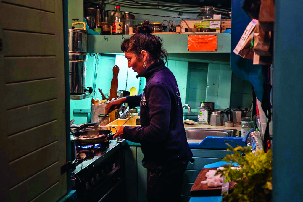 À l’arrière, les filles ont leur jardin : plusieurs plants de tomates cerises, devenus denses comme des buissons pour tenter de résister aux embruns, un pied de menthe qui prospère dans le trou d’un casier de pêche, de la lavande et des blettes. « Pour moi, c’est du quatre étoiles, commente Gwen, mais je sais que pour plein de gens, c’est rustique parce que c’est un dortoir. L’avantage, c’est que ça fait le tri dans les passagers qui embarquent avec nous. »