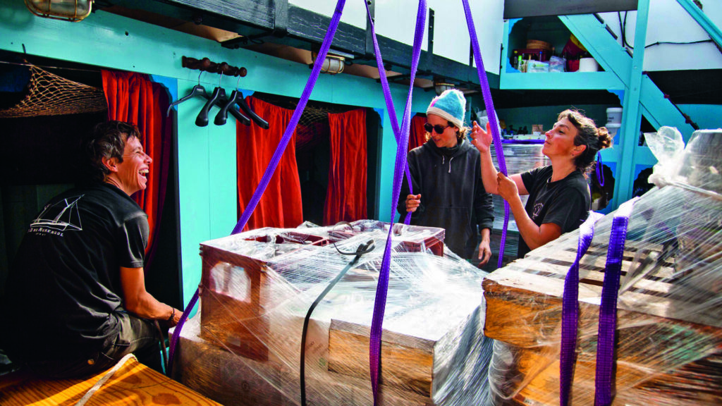 L’équipage entretient des liens solides avec le bureau de l’association An Test, propriétaire du bateau (lire p. 35), qui accueille volontiers leurs initiatives. Lorsque Notre-Dame de Rumengol est à Brest, quai Malbert, les marins programment des concerts ou des spectacles, la vaste cale s’y prêtant bien. C’est aussi une manière d’ouvrir gratuitement le bateau. Il y a eu des conteurs, un quatuor de chant lyrique, un orchestre en tournée à vélo, de la musique expérimentale… En juillet a eu lieu un « café mortel », initiative de Camille Lapouge, qui a lancé une association funéraire maritime, Anaon, pour l’organisation de funérailles en mer, à bord de bateaux du patrimoine. L’équipage souhaite aussi embarquer davantage de structures sociales pour des séjours de plus d’une journée. En tandem avec le bureau d’An Test, les marins font jouer leur réseau pour imaginer des projets. Les résidentes d’un foyer de mères isolées ont navigué à bord en 2024. Cette année, c’est au tour d’un foyer de l’Aide sociale à l’enfance.