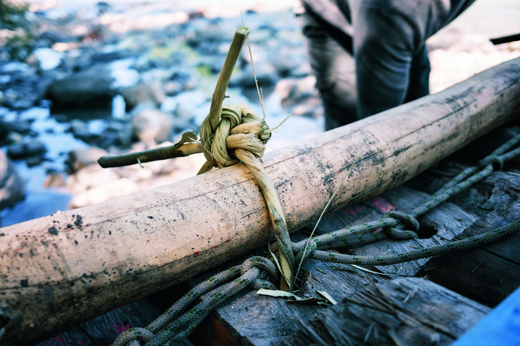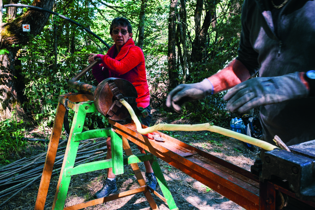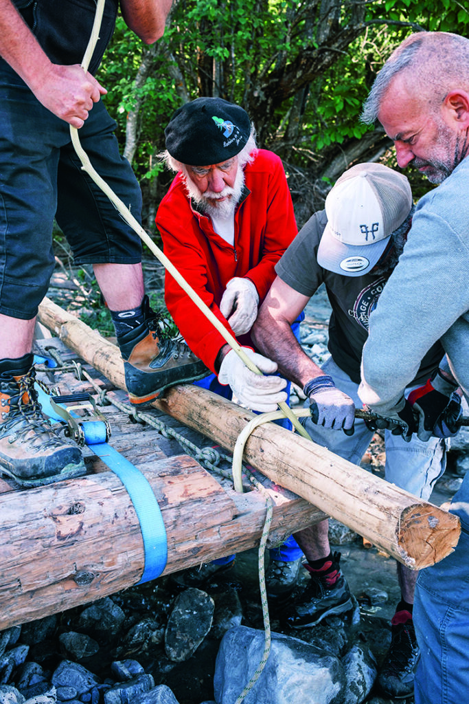 « Les anciens pouvaient mélanger les essences des billes, par exemple en mettant du mélèze en fonction des besoins, mais c’est un bois plus dense qui flotte moins bien. C’est pourquoi on privilégie le sapin pour ne pas naviguer en sous-marin ! » s’amuse Jean-Marie Gallino. La structure est ensuite solidement assemblée à l’aide d’une cinquantaine de « réortes », des branches de noisetier récoltées dans les forêts proches – « ni trop fines, ni trop épaisses, mais bien droites » –, défibrées au préalable à l’aide d’une machine « maison », composée d’un touret à bois et d’un étau, qui les vrille sans les casser. On obtient à la sortie une sorte de cordage que les radeliers peuvent tresser et nouer solidement. « Le réortage, c’est la partie la plus fastidieuse et la plus physique du chantier. Il faut parfois quatre personnes pour serrer correctement un nœud ! Une bonne tension est essentielle car c’est ce qui assure la rigidité de la structure de la radelle », continue Jean-Marie, qui orchestre les opérations.
